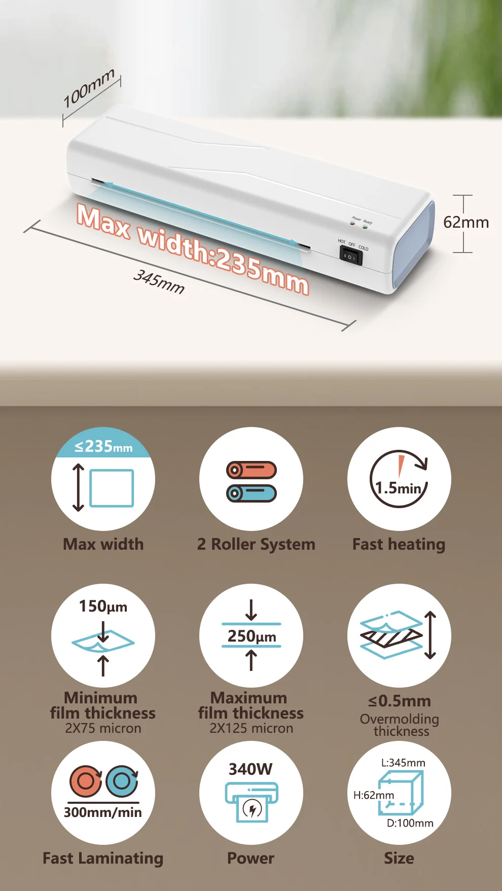 Material:ABS Color:Black,White Size:34.5x10x6.2cm Roller:2 Axes Paper Inlet Width: 235mm Minimum Plastic Film Thickness:150 (2x75) microns Maximum Plastic Film Thickness:250 (2x125) microns Minimum Plastic Film Size:Card (54x86mm) Maximum Plastic Film Size:A4 (216x303mm) Maximum Plastic Thickness:0...