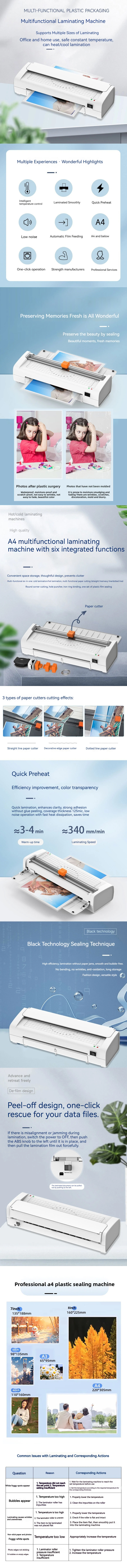 Material:ABS Color:White Size: 35.5×10.7×6.6cm Paper Size:A4 Laminating Width:320mm Specifications:3Inch/5Inch/6Inch/7Inch/8Inch/A4Universal Laminating Thickness:0.5mm Glue application speed:280mm/min Maximum Plastic Sealing Width:320mm Heater Temperature:125°-135° Voltage:220-240V Power:260W Weight..