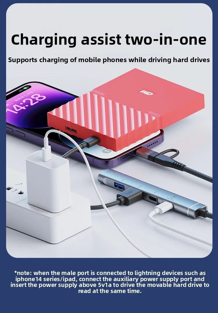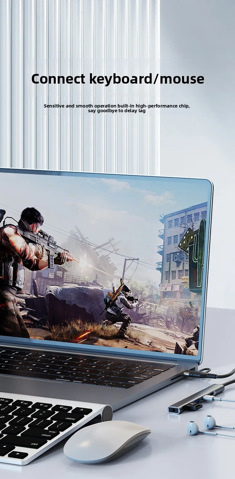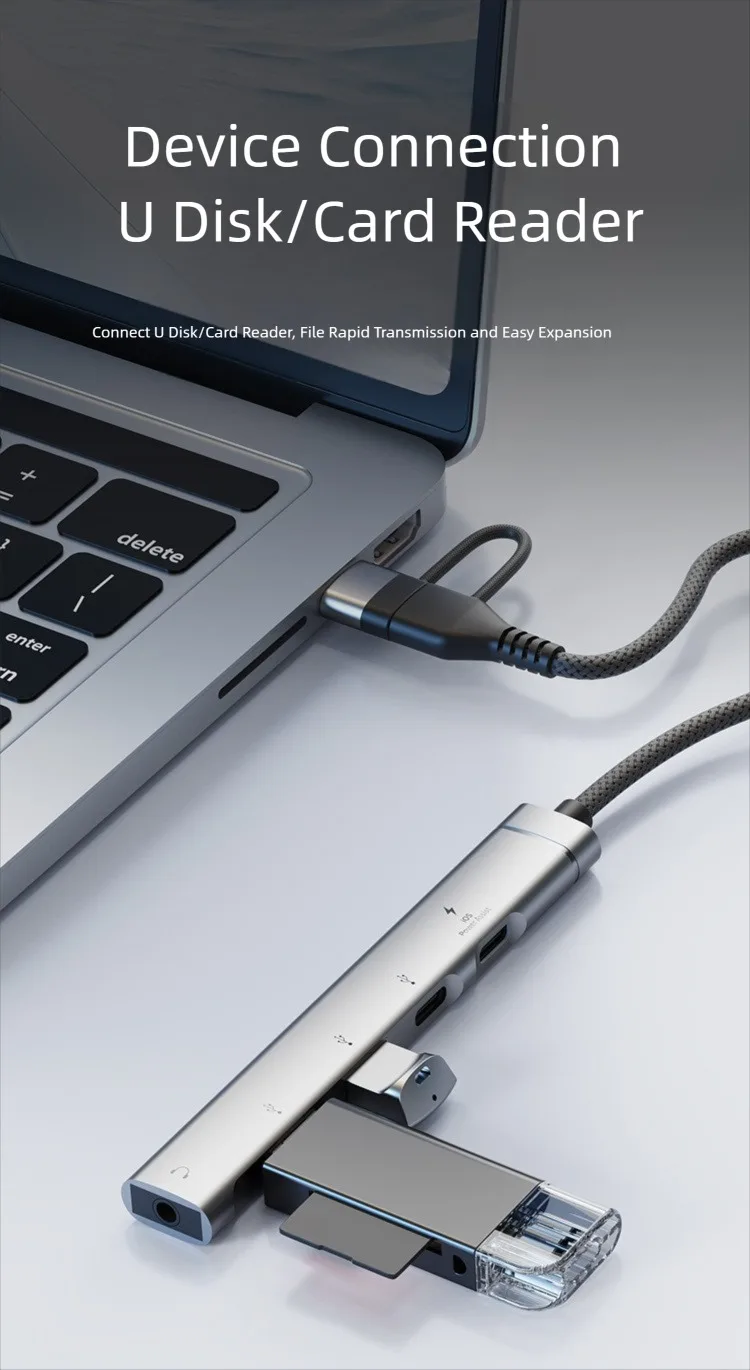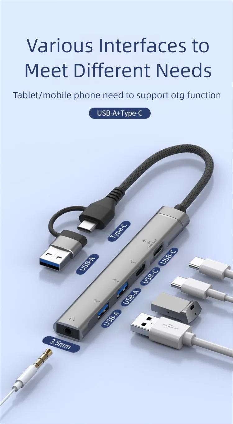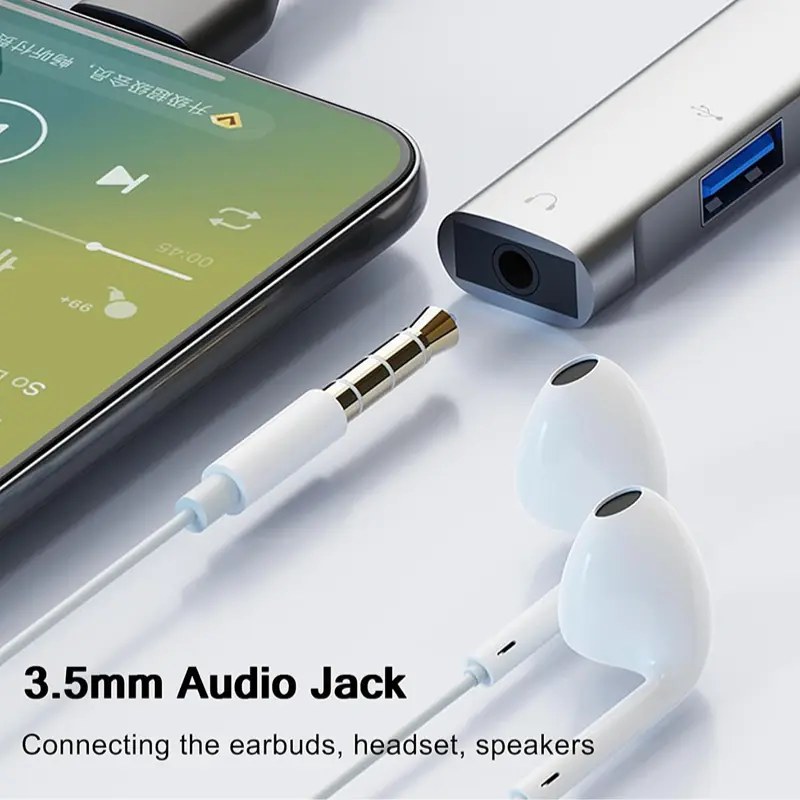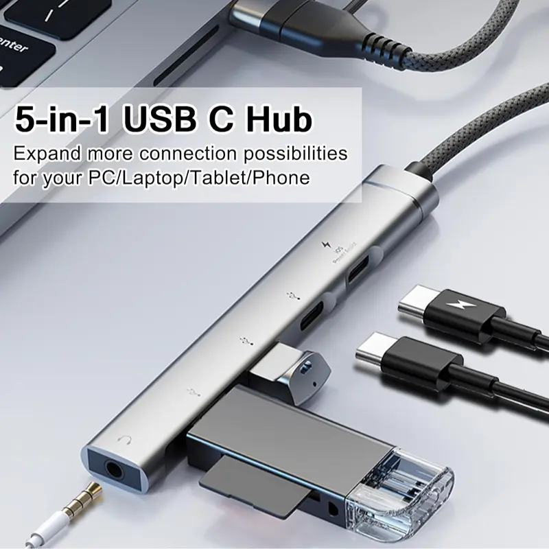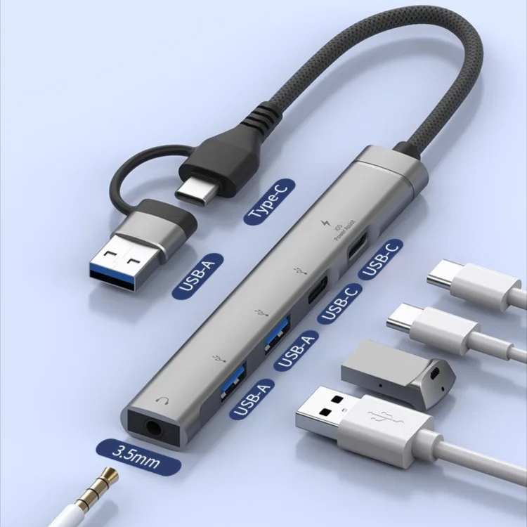 Type:Docking Stations & USB Hubs Funtion:3.5mm Interface Type:USB Type-C Ports:5 Material:Aluminium Alloy Color:Gray,Silver Size:11×3×1.2cm..